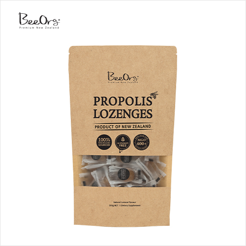 - BeeOrg Propolis Lozenges contain rare and high-rating Certified Organic Manuka Honey MGO400+.